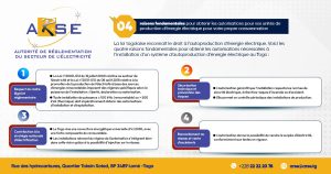 - La Loi n°2000-012 du 18 juillet 2000 relative au secteur de l’électricité et la Loi n°2018-010 du 08 août 2018 relative à la promotion de la production de l’électricité à base des sources d‘énergies renouvelables imposent des régimes spécifiques selon la puissance de l’installation : liberté, déclaration ou autorisation.