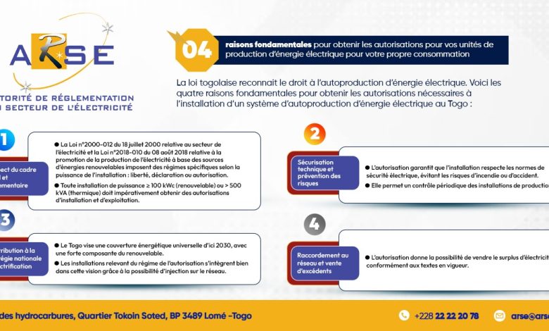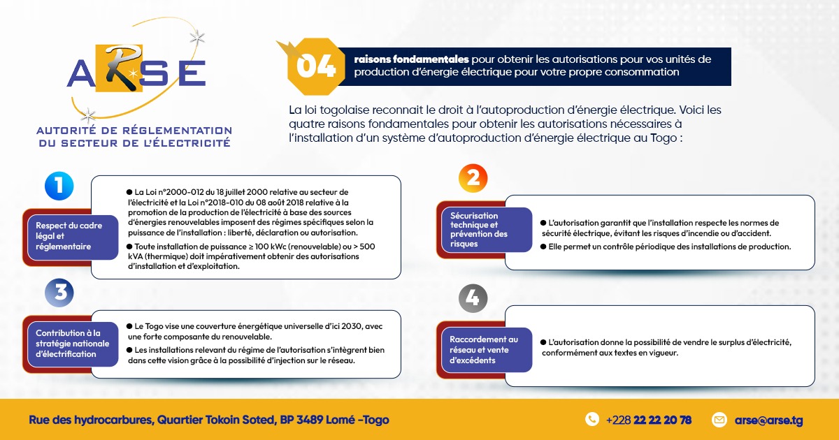 La loi togolaise reconnait le droit à l’autoproduction d’énergie électrique. Voici les quatre raisons fondamentales pour obtenir les autorisations nécessaires à l’installation d’un système d’autoproduction d’énergie électrique au Togo :