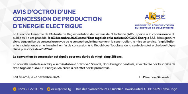 La Direction Générale de l’Autorité de Réglementation du Secteur de l’Electricité (ARSE) porte à la connaissance du public qu’il a été procédé, le 03 décembre 2023 entre l’Etat togolais et la société SOKODE Energie SAS, à la signature d’une convention de concession en vue de la conception, le financement, la construction, la mise en service, l’exploitation et la maintenance et le transfert en fin de concession à la République Togolaise de la centrale solaire photovoltaïque d’une puissance de 42 MWAC. La convention de concession est signée pour une durée de vingt-cinq (25) ans. La nouvelle centrale électrique sera installée à Salimdè à Sokodé, dans la région centrale, et exploitée par la société de droit togolais SOKODE Energie SAS créée à cet effet par le promoteur.