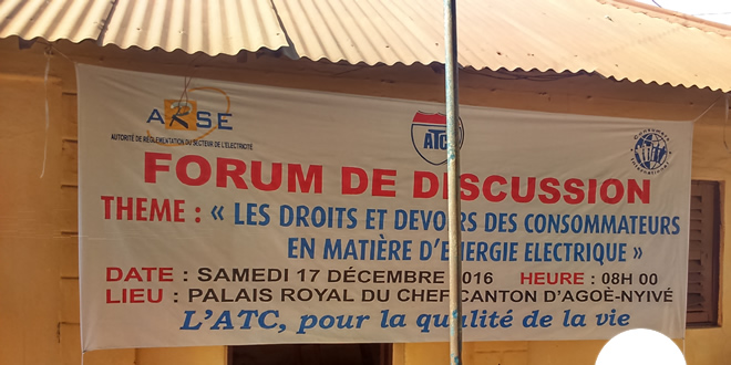 A l’initiative de l’Association Togolaise des Consommateurs (ATC), l’Autorité de Réglementation du Secteur de l’Electricité (ARSE) a échangé avec les populations du canton d’Agoè Nyivé le 17 décembre 2016 dernier. Objectif de cette rencontre, les entretenir sur la possibilité de recourir à l’Autorité de Réglementation du Secteur de l’Electricité (ARSE) s’ils ne sont pas satisfaits des prestations de la CEET (Compagnie Energie Electrique du Togo).